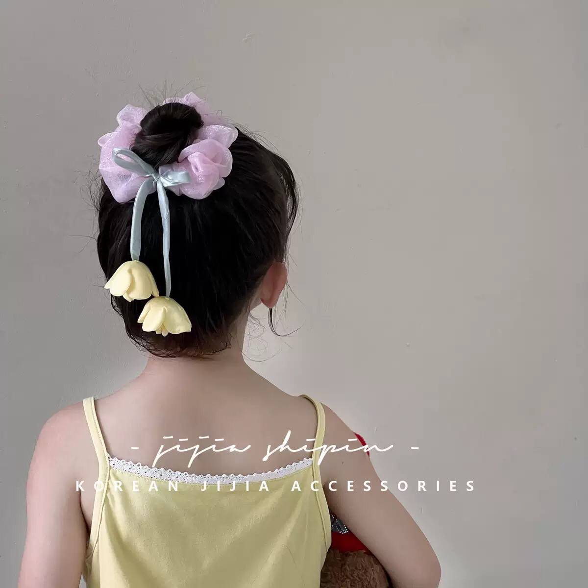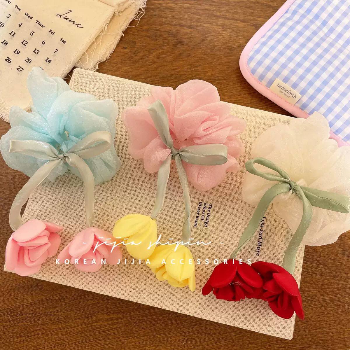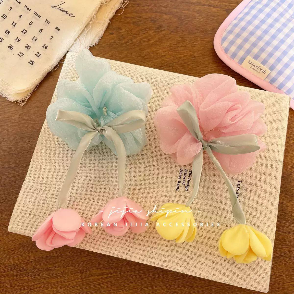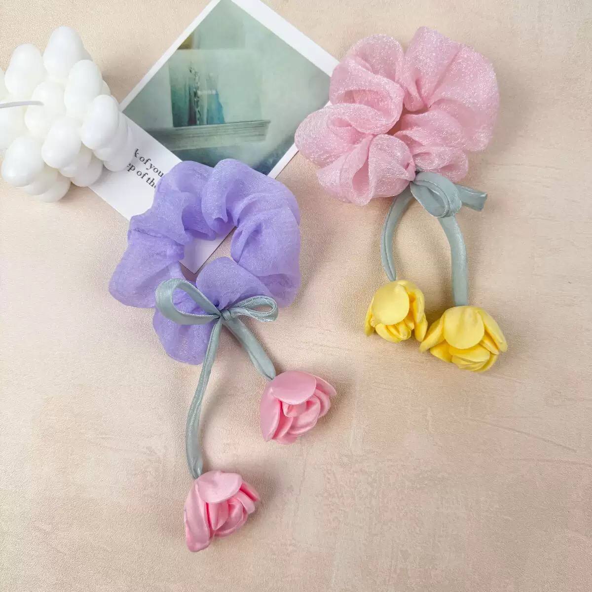 أستك خامته شيفون ، مزينة بفيونكات ناعمة وتدليات على شكل ورود توليب بألوان رقيقة .