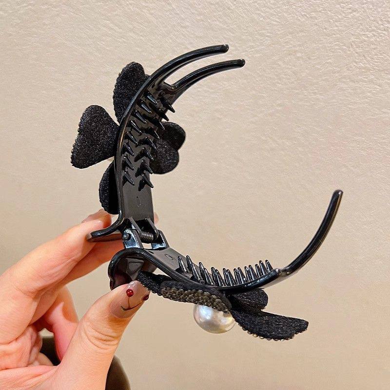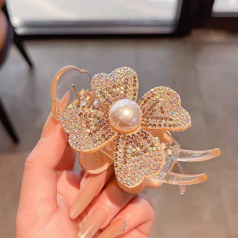 (مشبك) على شكل زهرة مرصعة بالكامل بفصوص الكريستال اللامعة، مع حبة لؤلؤ مركزية فخمة.